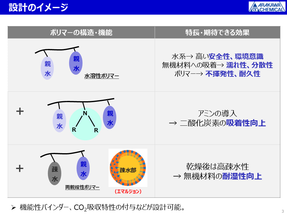 ここからは当社の「化学吸着」材料を説明していくね。当社は従来から「紙用薬品」をずっと開発していることもあって「水系ポリマー」の設計・合成が非常に得意なんだ。この「水系ポリマー合成技術」を駆使しながら、CO₂吸着材として効果のある「アミン部位」を導入することで「二酸化炭素(CO₂)吸着用ポリアミン」を開発したんだ。