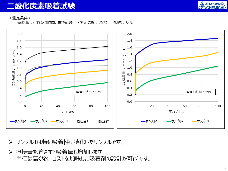 今回提供できるサンプルは3つなんだけど、そのうち「サンプル1」は特にCO₂吸着量に特化したポリアミンになるよ。担持量の調製で他社品以上の吸着量達成も可能なんだ。